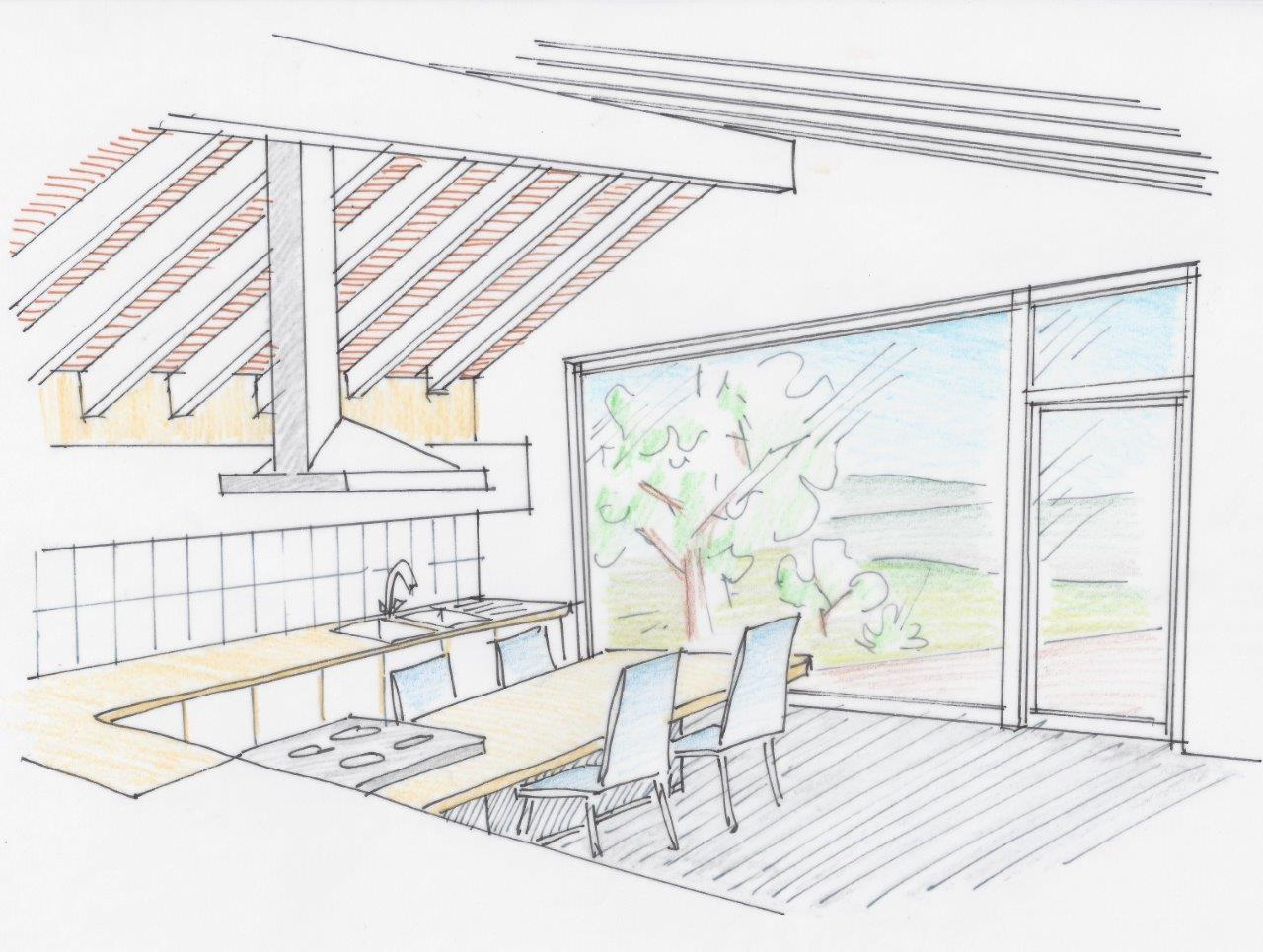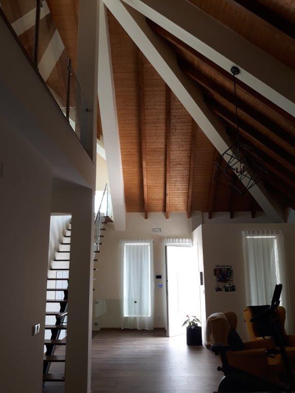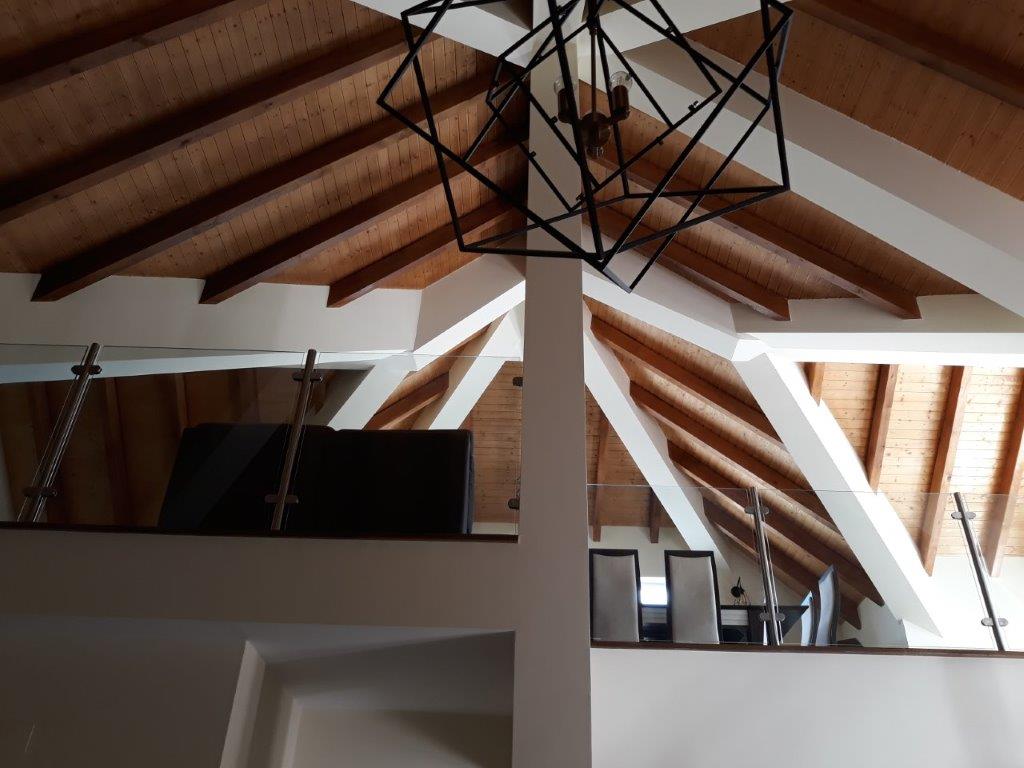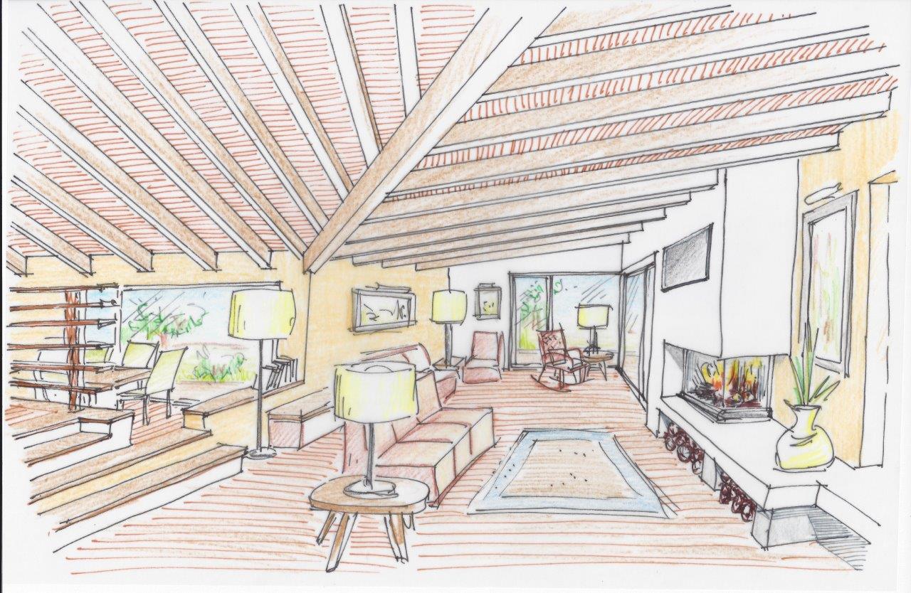 Sala ampla com mezanino intermédio e teto com vigas e forro de madeira. Área de construção: